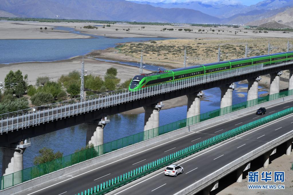 試運行的復(fù)興號列車行駛在雅魯藏布江畔(6月16日攝)。
