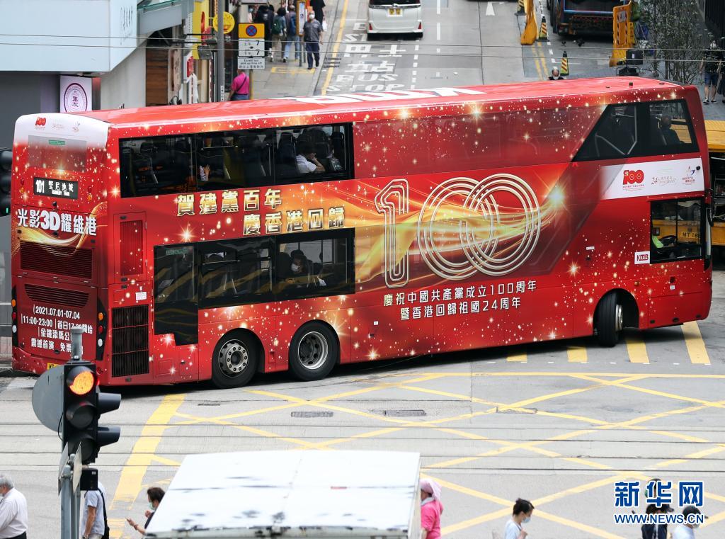 6月29日在香港街頭拍攝的公交巴士上的慶祝標(biāo)語。