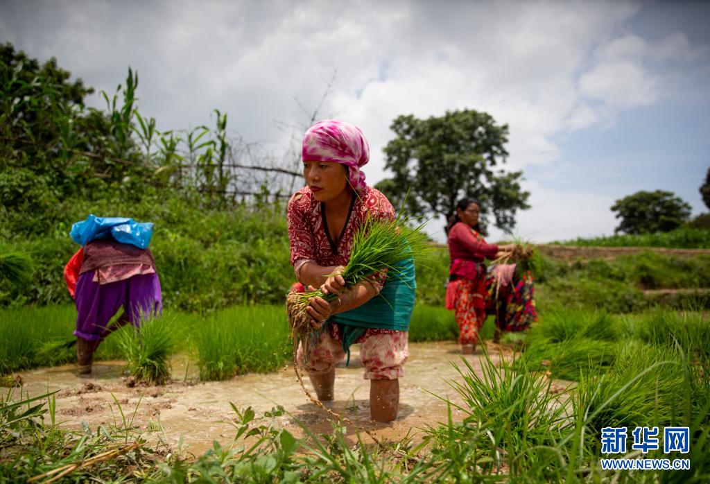 6月29日,農(nóng)民在尼泊爾中部勒利德布爾附近的稻田里插秧。