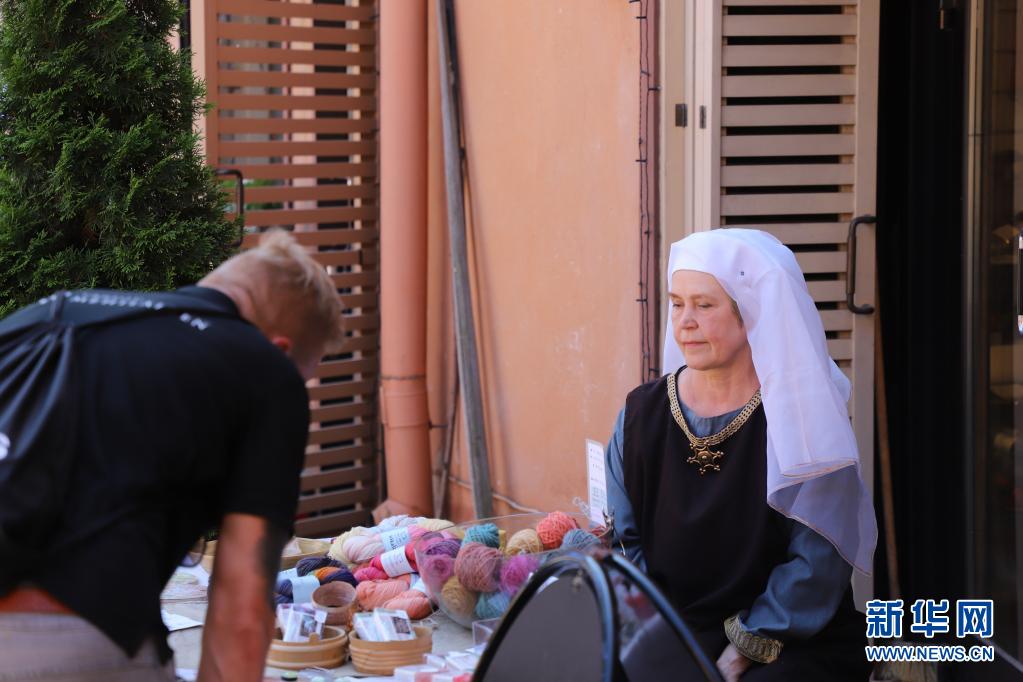 7月1日,一名身著中世紀風格服裝的攤主在芬蘭圖爾庫舉行的“中世紀市集”上向顧客售賣紀念品。