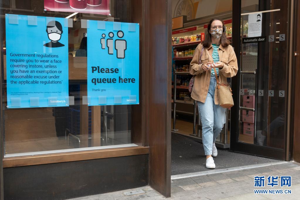 7月12日,一名戴口罩的女子走出英國倫敦一家超市。