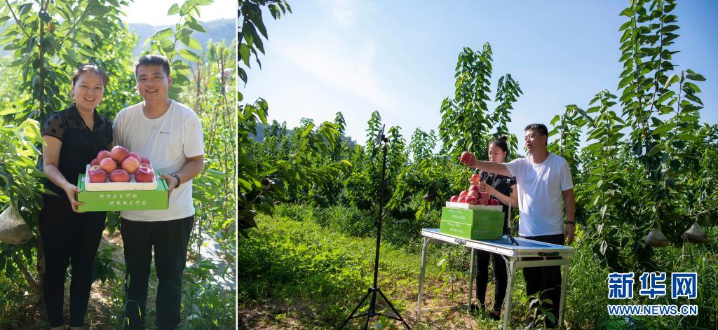 拼版照片:左圖為在山西省吉縣,武偉和妻子梁雪雪展示吉縣蘋果;右圖為武偉和妻子梁雪雪通過網(wǎng)絡(luò)直播銷售蘋果(7月9日攝)。今年30歲的武偉是山西省洪洞縣武家莊村人,2009年大學(xué)畢業(yè)后,他開過快遞公司,也做過微商。期間,他看到來自家鄉(xiāng)的蘋果存在質(zhì)高價低、銷售不暢的情況,于是開始通過電商銷售優(yōu)質(zhì)蘋果。今年以來,武偉和妻子趁著農(nóng)閑嘗試直播帶貨,沒想到短短數(shù)月粉絲量就已過萬。目前,只要天氣允許,他們每天都會直播兩場,日銷售蘋果500余單。