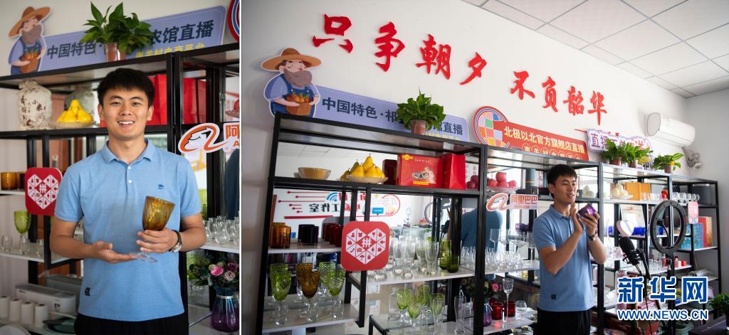 拼版照片:左圖為胡翔宇展示山西省祁縣產(chǎn)的玻璃杯;右圖為胡翔宇通過網(wǎng)絡(luò)直播介紹玻璃杯(7月6日攝)。今年31歲的胡翔宇是祁縣南關(guān)村人,在從事農(nóng)村電商之前,他做過工程設(shè)計、當(dāng)過教師。2019年,胡翔宇回到家鄉(xiāng),開始從事祁縣特產(chǎn)和特色農(nóng)產(chǎn)品的銷售。2021年,南關(guān)村成立了電商平臺,為返鄉(xiāng)青年提供創(chuàng)業(yè)服務(wù)和便利條件,胡翔宇和他的團隊第一時間入駐。為拓寬銷售渠道,他開始嘗試直播帶貨,1個多月的時間,粉絲量已經(jīng)突破3000余人。
