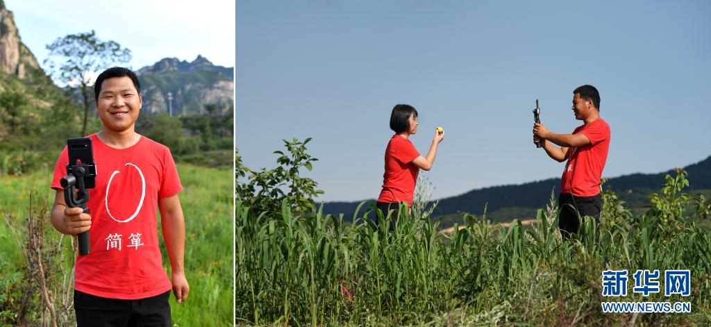 拼版照片:左圖為劉瑞旭拿著手機(jī)穩(wěn)定器;右圖為在山西省黎城縣巖井村,劉瑞旭(右)和合作社同事在谷子地里直播(7月8日攝)。今年29歲的劉瑞旭開過(guò)飯店、賣過(guò)房子、種過(guò)果樹,2019年回到老家平順縣榔樹園村做起了職業(yè)農(nóng)民,成為太行山上的“新農(nóng)人”?;卮搴?,劉瑞旭和合作社的同事抓住網(wǎng)絡(luò)直播帶貨的熱潮,嘗試田間地頭直播。借助網(wǎng)絡(luò)的力量,合作社的小米搭上了“互聯(lián)網(wǎng)+”快車銷往全國(guó)各地。