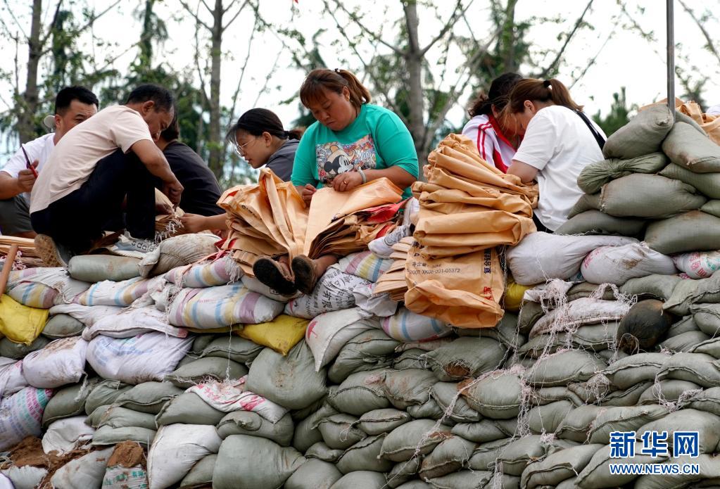 當日,在河南省鶴壁市??h傅莊堤上,不少群眾自發(fā)前來和救援人員一起裝沙袋、運沙袋,共筑堤壩。受持續(xù)強降雨影響,??h防汛形勢嚴峻,傅莊堤主要為??h縣城及26個村莊提供保護。新華社記者 李安 攝