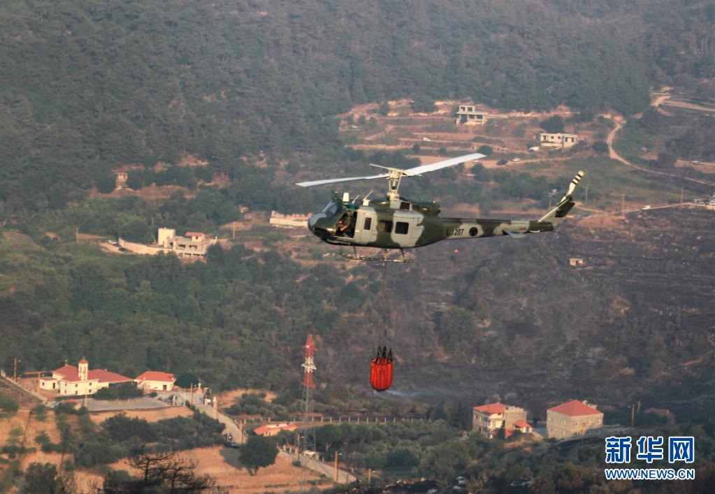 7月29日,黎巴嫩軍方直升機在阿卡爾省火災現(xiàn)場參與滅火行動。
