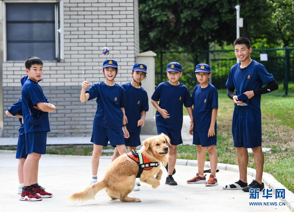 在四川省森林消防總隊(duì)特勤大隊(duì),孩子們和搜救犬“麒麟”互動(dòng)(7月27日攝)。
