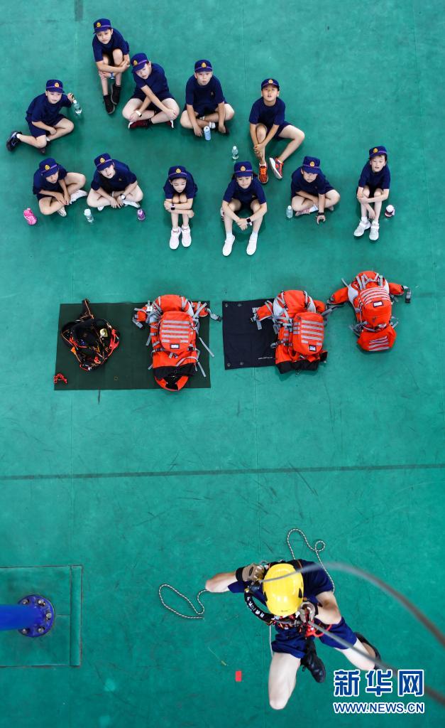 在四川省森林消防總隊特勤大隊,孩子們在觀摩繩索高空救援(7月27日攝)。