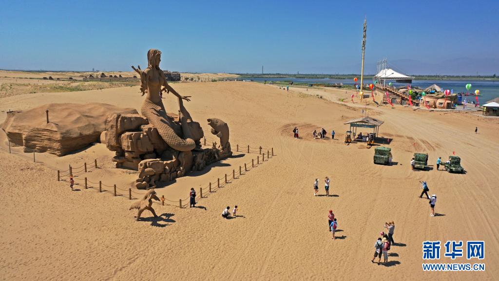 這是7月31日拍攝的寧夏沙湖景區(qū)內(nèi)的巨型沙雕景觀(無人機(jī)照片)。