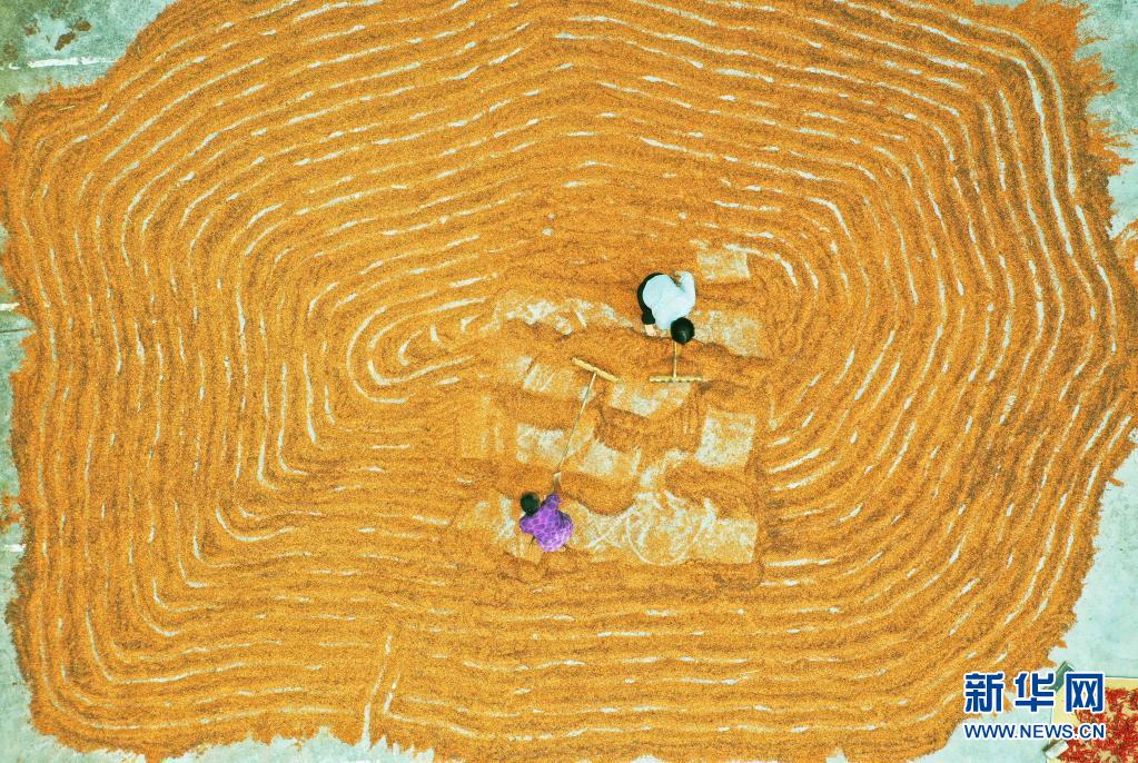 立秋過(guò)后,貴州省赤水市農(nóng)民種植的水稻、高粱、玉米、辣椒等農(nóng)作物迎來(lái)收獲季,當(dāng)?shù)卮迕駬屪デ绾锰鞖鈱⑹斋@的農(nóng)作物鋪放在房前屋后的壩子中進(jìn)行晾曬,構(gòu)成一幅幅美麗的“曬秋圖”。