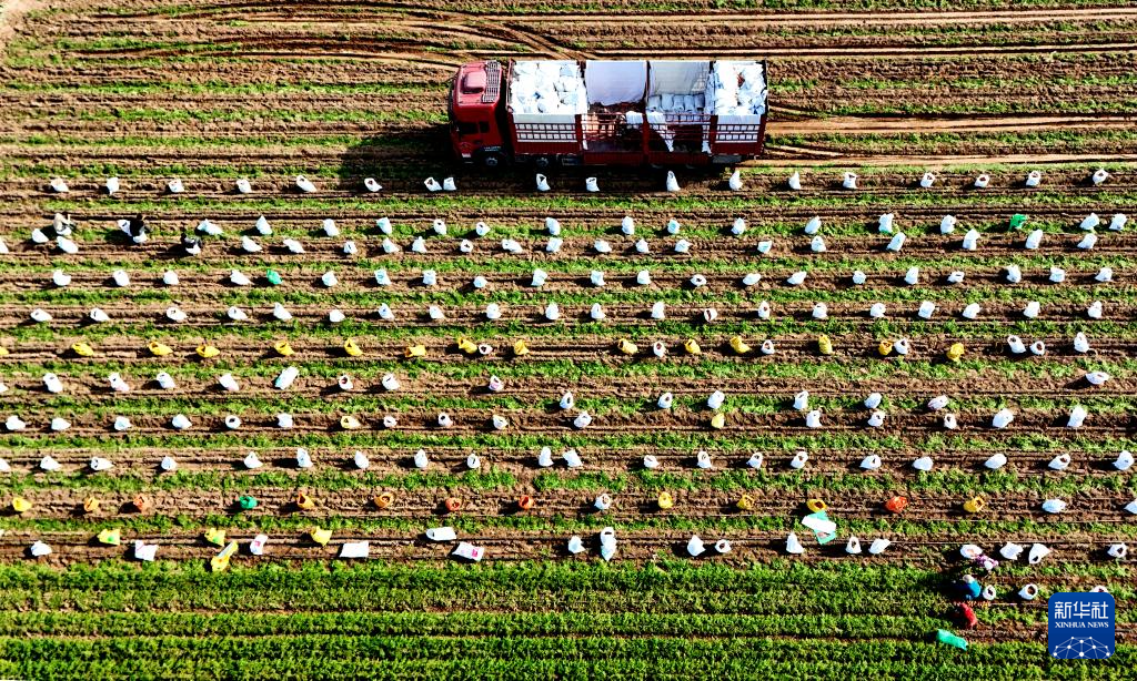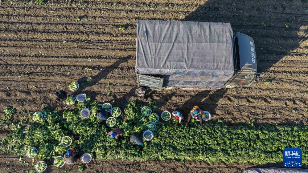 12月7日,河北省唐山市玉田县虹桥镇农民在田间将冬储大白菜装车外运(无人机照片)。