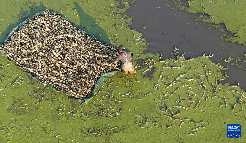 12月7日,江苏省海安市墩头镇一处浅水藕种植基地,藕农忙着采收浅水藕(无人机照片)。