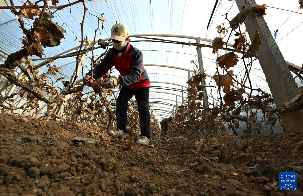 12月7日,农民在河北省石家庄市新华区陈村葡萄采摘园里剪枝管护。