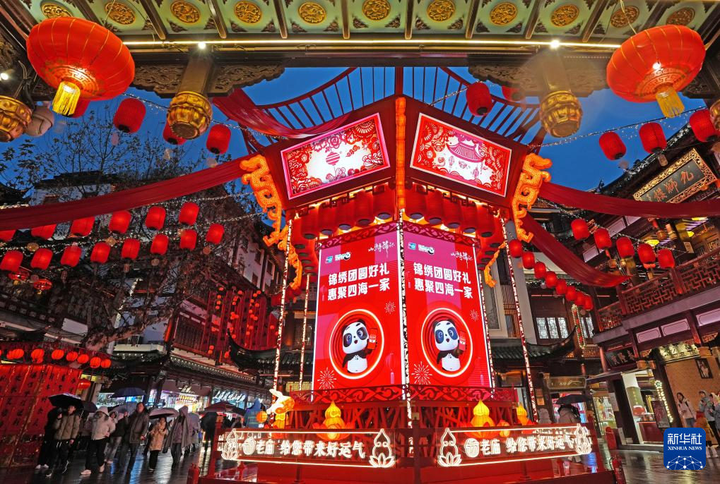 1月26日,豫园灯会上的春联与流光溢彩的花灯营造出新春的喜庆氛围。
