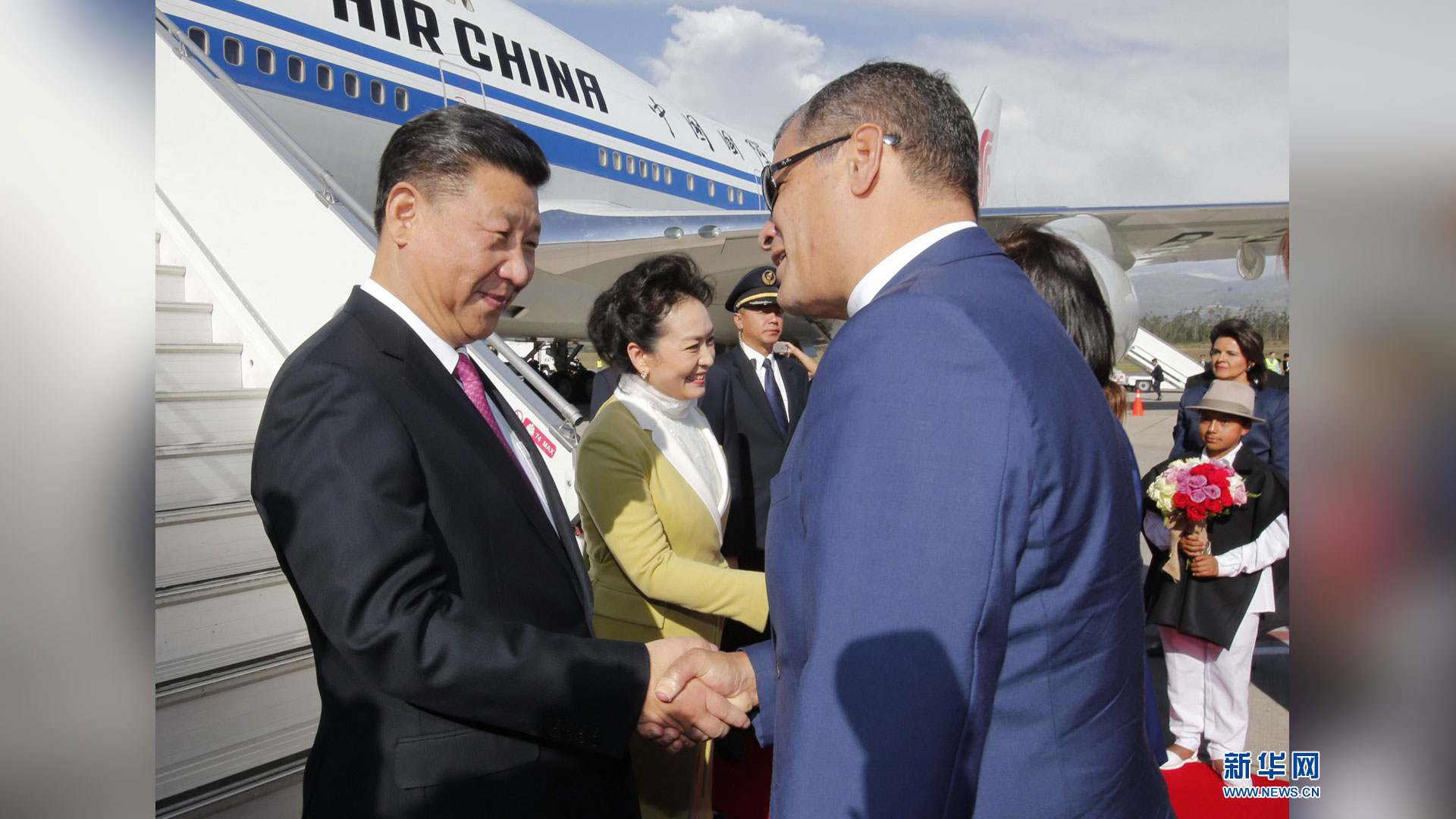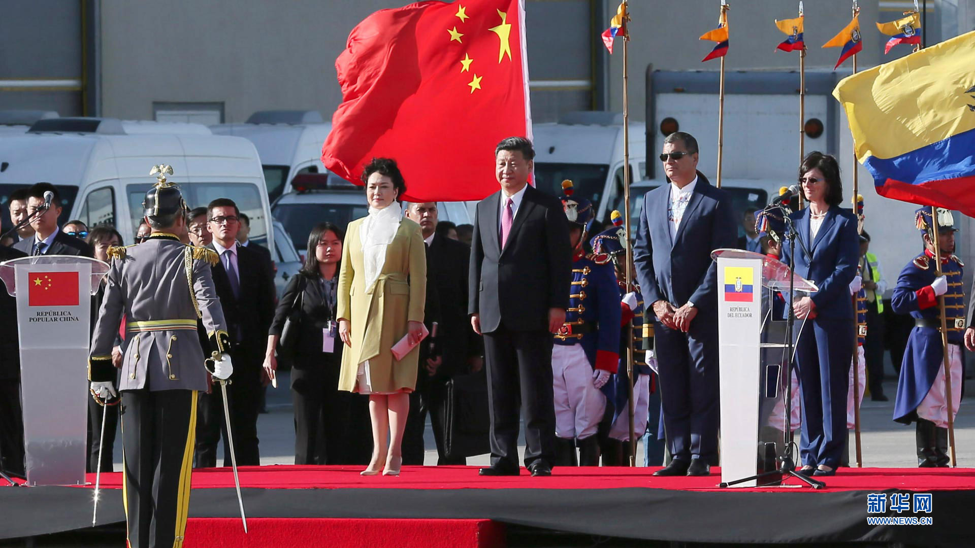 當(dāng)?shù)貢r(shí)間11月17日,國(guó)家主席習(xí)近平乘專機(jī)抵達(dá)基多,開(kāi)始對(duì)厄瓜多爾共和國(guó)進(jìn)行國(guó)事訪問(wèn)。厄瓜多爾總統(tǒng)科雷亞和夫人馬勒布等在機(jī)場(chǎng)熱情迎接習(xí)近平和夫人彭麗媛。新華社記者 鞠鵬 攝2016-11-18
