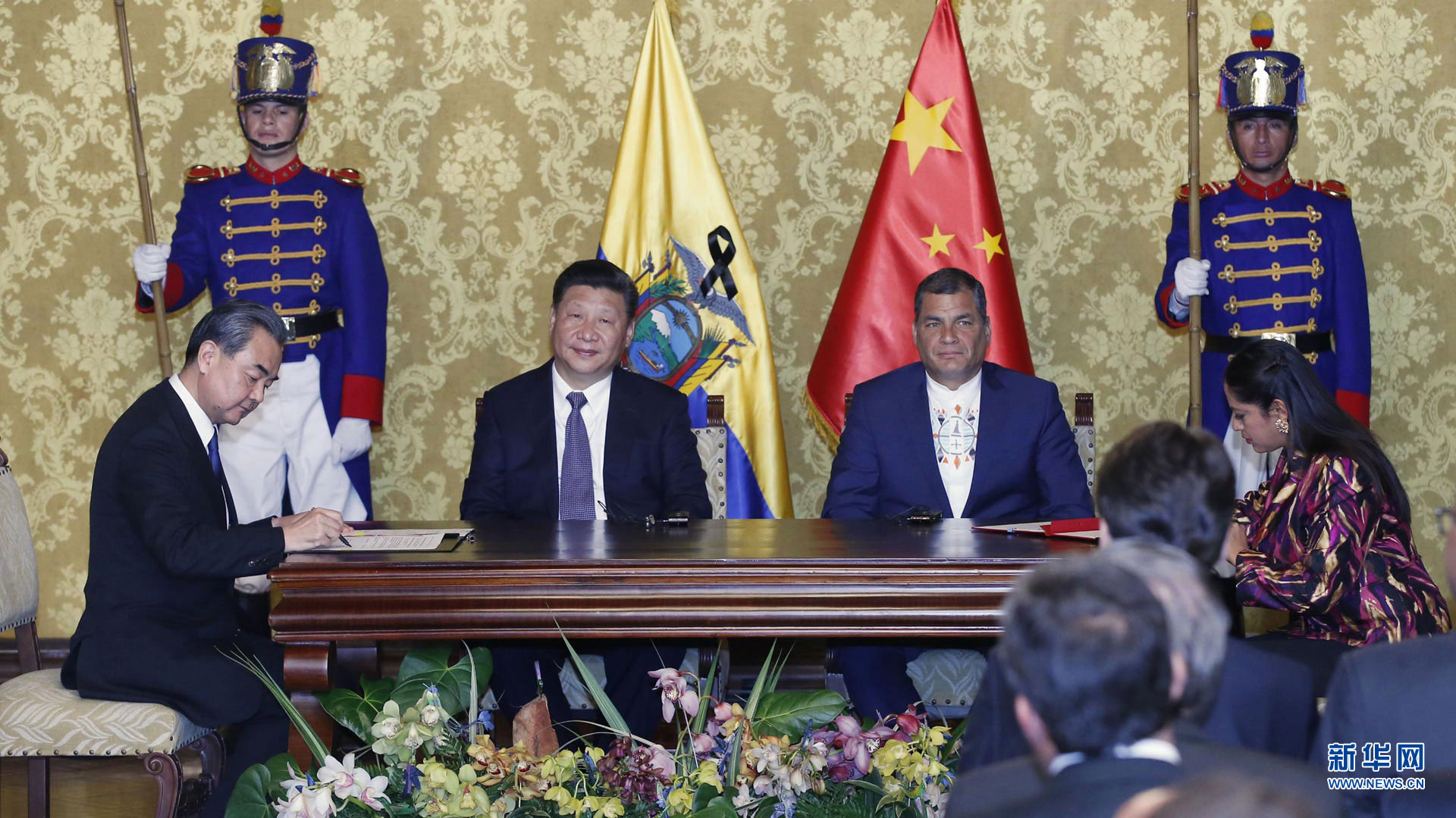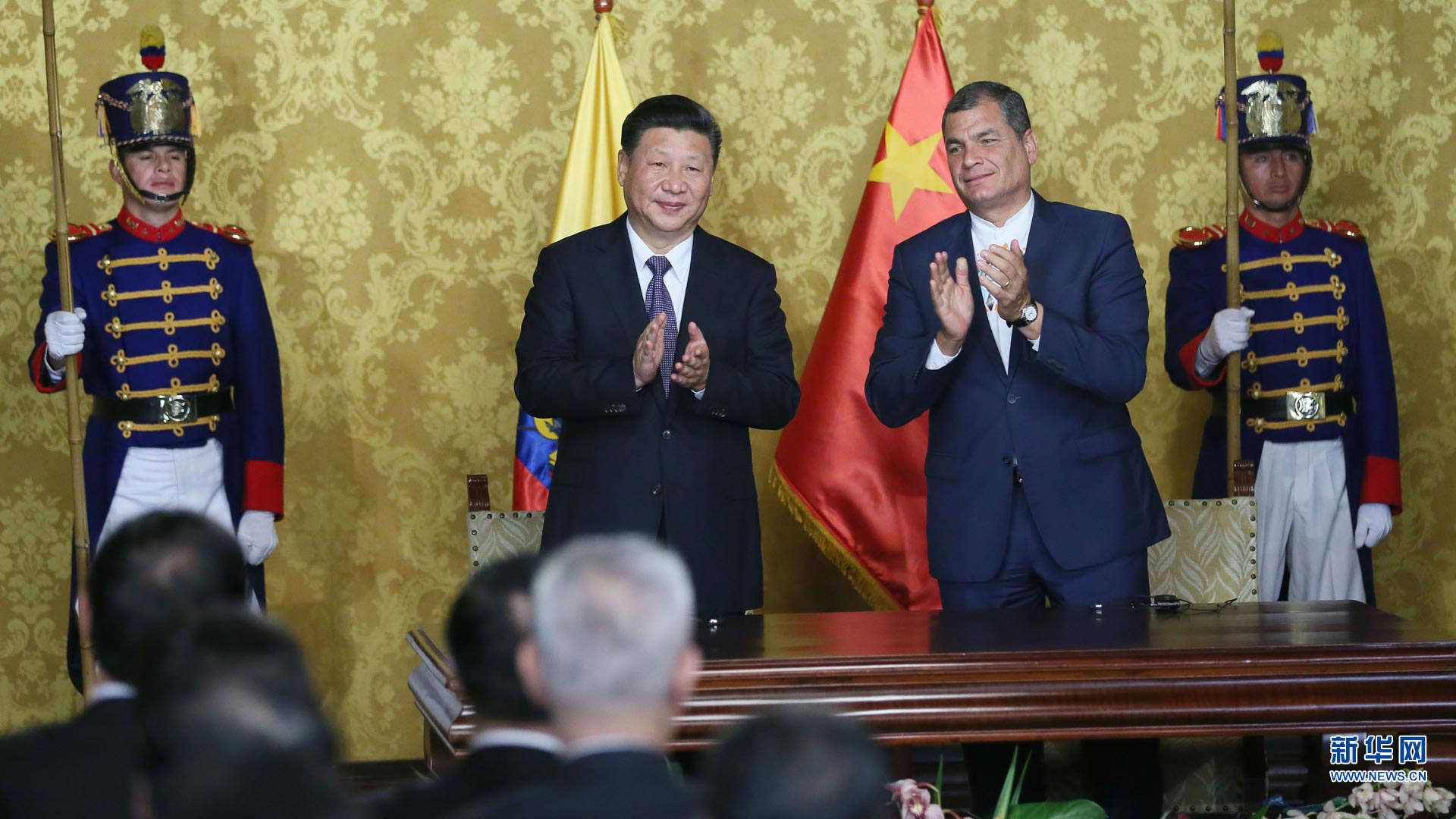 當(dāng)?shù)貢r(shí)間11月17日,國(guó)家主席習(xí)近平在基多同厄瓜多爾總統(tǒng)科雷亞舉行會(huì)談。這是會(huì)談后,兩國(guó)元首見(jiàn)證雙邊合作文件的簽署。 新華社記者 鞠鵬攝2016-11-18