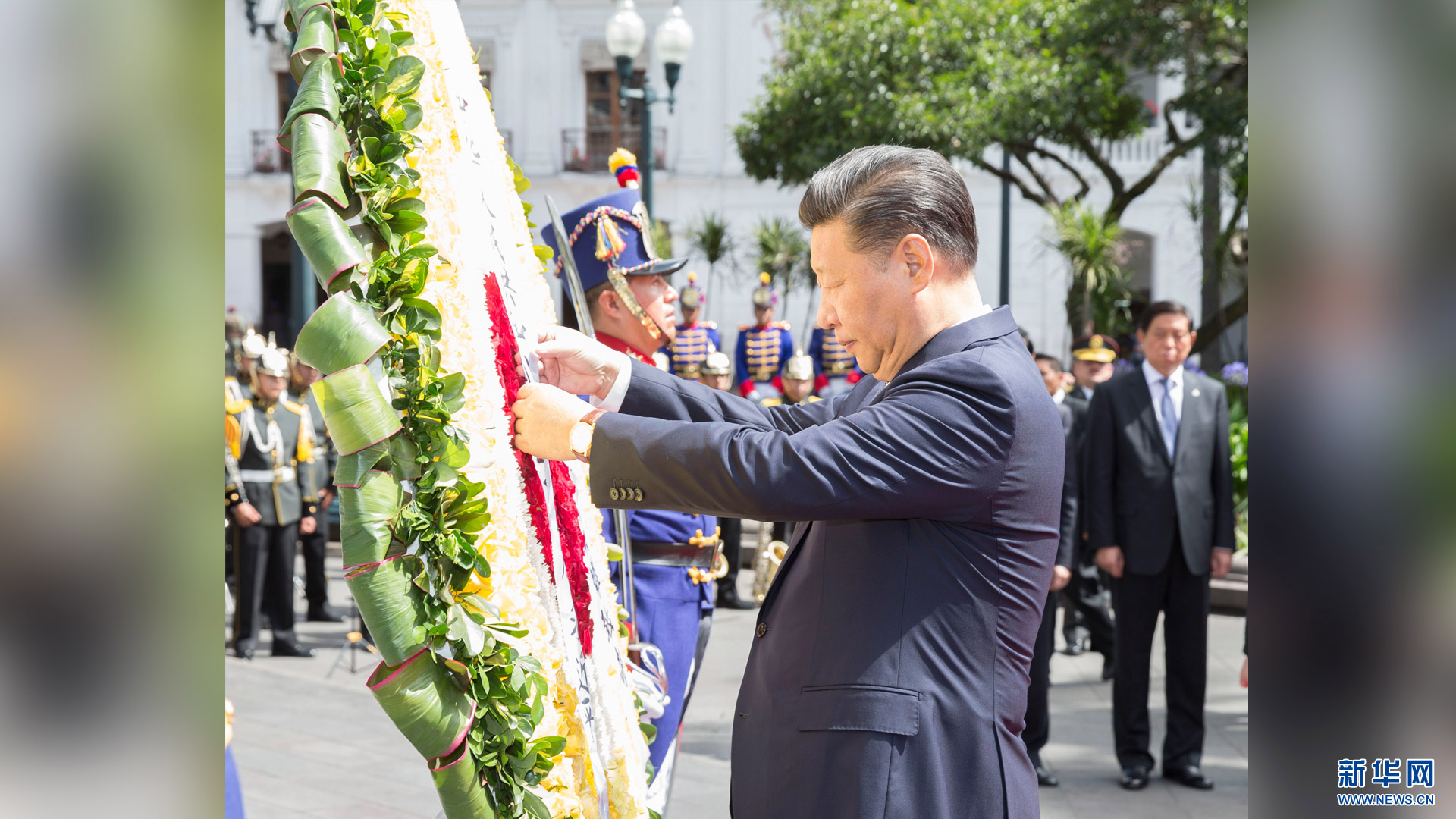 當(dāng)?shù)貢r(shí)間11月18日,國(guó)家主席習(xí)近平向厄瓜多爾獨(dú)立英雄紀(jì)念碑敬獻(xiàn)花圈。 新華社記者 黃敬文 攝2016-11-19