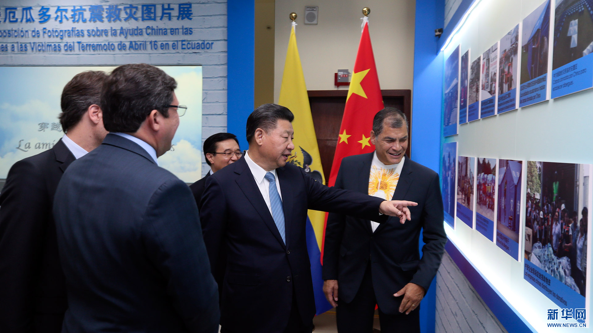 當(dāng)?shù)貢r(shí)間11月18日,國(guó)家主席習(xí)近平在基多同厄瓜多爾總統(tǒng)科雷亞共同出席中方援建的厄瓜多爾公共安全應(yīng)急指揮中心聯(lián)合實(shí)驗(yàn)室揭牌儀式,喬內(nèi)醫(yī)院奠基、科卡科多-辛克雷水電站竣工發(fā)電視頻連線活動(dòng)。這是兩國(guó)元首共同參觀中方支援厄瓜多爾抗震救災(zāi)圖片展。新華社記者 蘭紅光 攝2016-11-19
