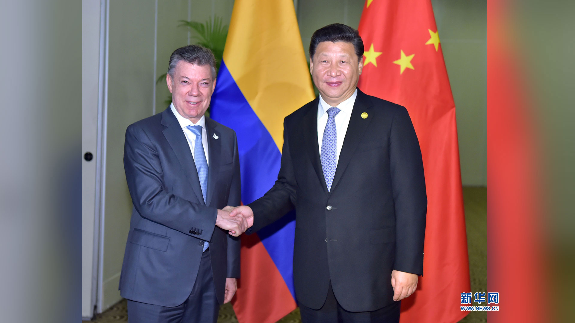11月19日,國(guó)家主席習(xí)近平在利馬會(huì)見(jiàn)哥倫比亞總統(tǒng)桑托斯。新華社記者 李濤 攝2016-11-20