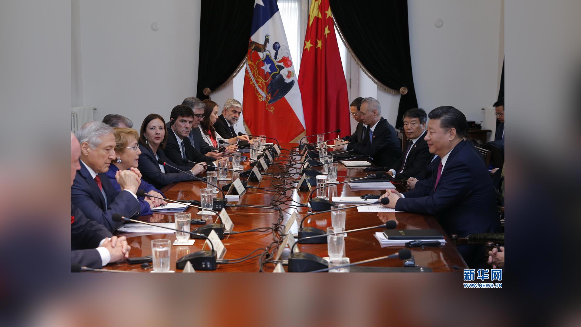 11月22日,國(guó)家主席習(xí)近平在圣地亞哥同智利總統(tǒng)巴切萊特舉行會(huì)談。 新華社記者 鞠鵬 攝2016-11-23