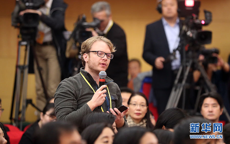 ??? 10月21日,十九大新聞中心舉辦記者招待會,邀請中共中央統(tǒng)戰(zhàn)部常務副部長張裔炯、副部長冉萬祥,中共中央對外聯(lián)絡部副部長郭業(yè)洲介紹黨的統(tǒng)一戰(zhàn)線工作和黨的對外交往情況,并回答記者提問。圖為彭博新聞社記者提問。新華網(wǎng) 郝廣鵬攝