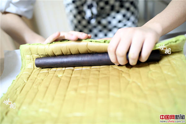 涂抹好奶油卷起來后,再加一些小裝飾,陳騫自創(chuàng)的宇治抹茶紅豆蛋糕卷就做成了。