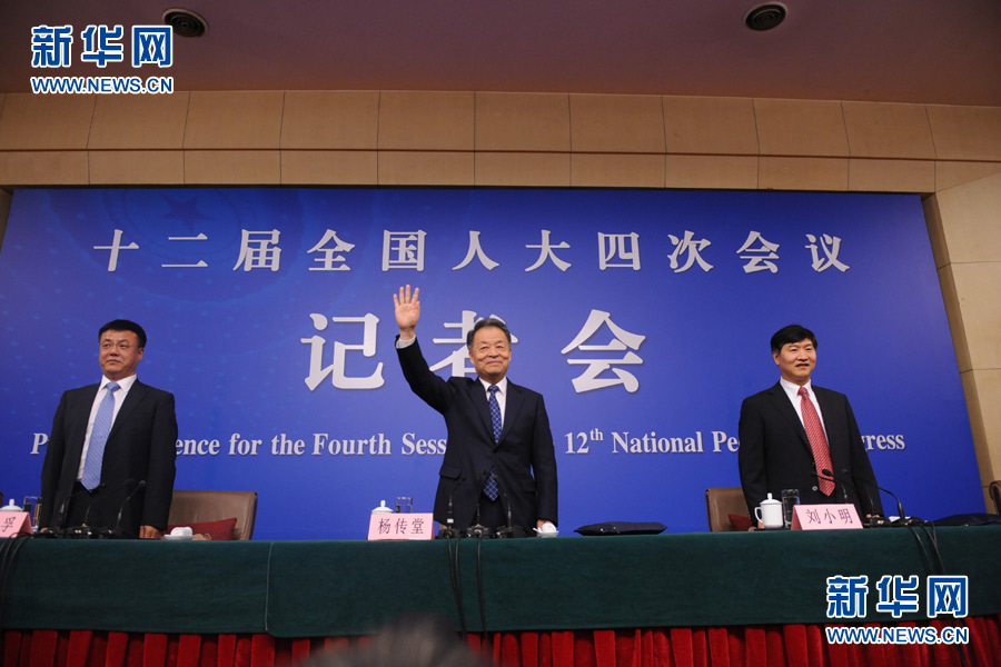 十二屆全國人大四次會(huì)議新聞中心于3月14日(星期一)10時(shí)在梅地亞中心多功能廳舉行記者會(huì),邀請交通運(yùn)輸部部長楊傳堂、交通運(yùn)輸部運(yùn)輸服務(wù)司司長劉小明、北京交通發(fā)展研究中心主任郭繼孚就“深化出租汽車改革與發(fā)展”的相關(guān)問題回答中外記者的提問。圖為楊傳堂、劉小明、郭繼孚到達(dá)會(huì)場,楊傳堂向記者揮手致意。新華網(wǎng)/中國政府網(wǎng) 陳杰 攝?