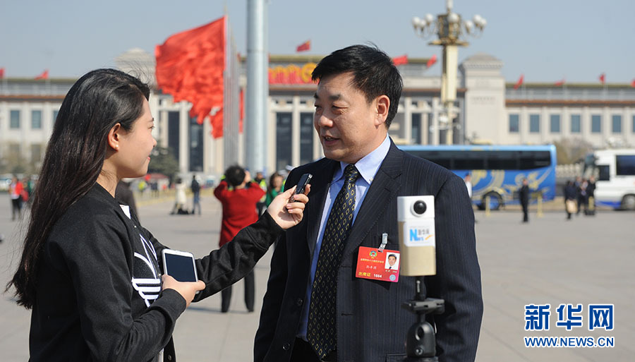 ?????3月14日,全國政協(xié)十二屆四次會議在北京人民大會堂舉行閉幕會。這是全國政協(xié)委員在人民大會堂外接受記者采訪。新華網(wǎng)/中國政府網(wǎng)??陳杰 攝