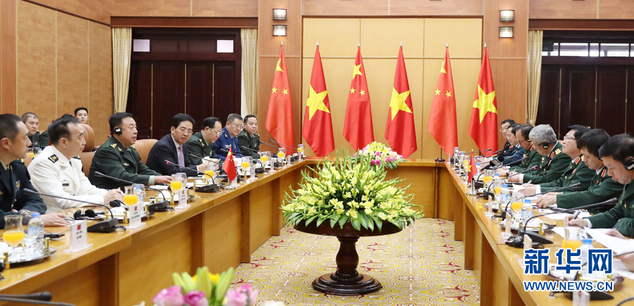 ??? 6月18日,在越南首都河內,正在越南訪問的中央軍委副主席范長龍(左三)與越南國防部長吳春歷(右三)舉行會談。 新華社發(fā)(李曉偉攝)