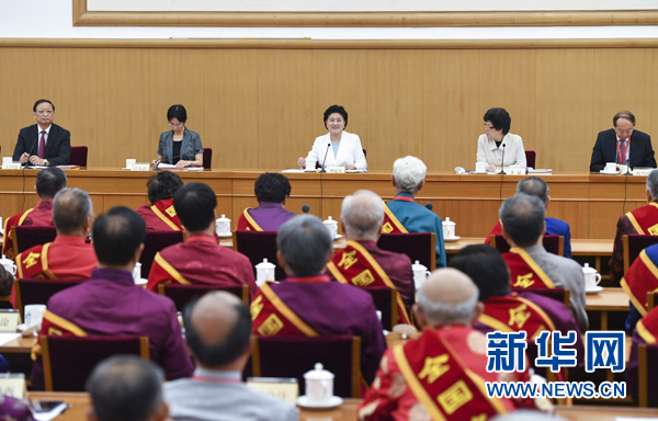 6月29日,中共中央政治局委員、國務院副總理劉延東在北京接見第三屆國醫(yī)大師和首屆全國名中醫(yī)代表并座談。 新華社記者 張領(lǐng) 攝