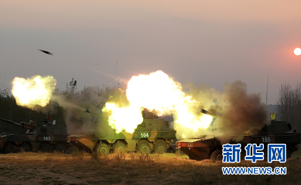 在“中部礪劍-2016·確山C”演習(xí)跨晝夜實(shí)彈演練中,參演的葉挺獨(dú)立團(tuán)官兵進(jìn)行某型榴彈炮實(shí)彈射擊(2016年9月21日攝)。新華社發(fā)(申冬冬 攝)