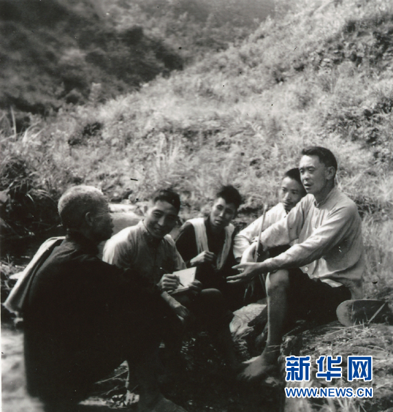 甘祖昌將軍(右一)在地頭和農(nóng)民們聊天(資料圖片)。新華社發(fā)