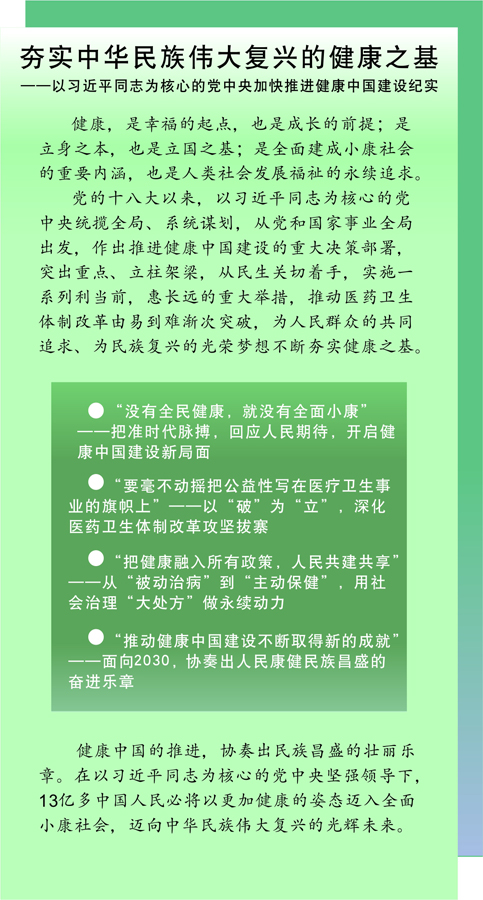 新華社北京10月13日電? 題:夯實(shí)中華民族偉大復(fù)興的健康之基——以習(xí)近平同志為核心的黨中央加快推進(jìn)健康中國(guó)建設(shè)紀(jì)實(shí)