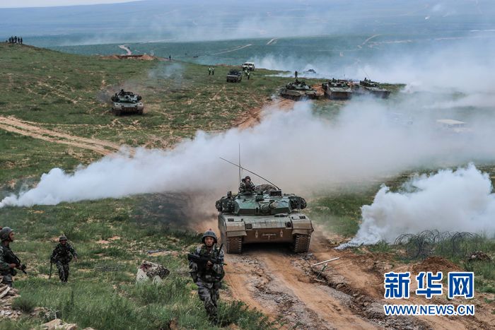 “跨越-2016·朱日和A”演習(xí)進(jìn)入實(shí)兵對抗陣地進(jìn)攻戰(zhàn),這是紅藍(lán)雙方首場對抗中紅軍步兵和坦克協(xié)同(2016年7月19日攝)。新華社發(fā)(王佳寅 攝)