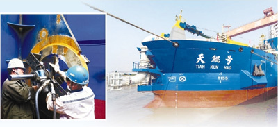 “船上鋼樁臺(tái)車安裝了4個(gè)大油缸,單個(gè)就達(dá)38噸,所有安裝誤差都只有0.2毫米”,安裝輪機(jī)車間主任沙勝紅說,“考驗(yàn)還在繼續(xù)”。輪機(jī)車間的工人全部是訓(xùn)練有素的技術(shù)員工,他們克服了難以想象的困難,硬是拿下全船高難度的設(shè)備安裝工作,質(zhì)量贏得船東、船檢的一致好評。