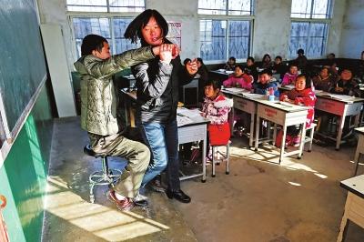這節(jié)課,學(xué)生們聽得很認真。45分鐘的課程很快過去,下課后,妻子又把曹老師背了下來?!拔覀儛鄄芙處?。”班里許多小朋友告訴記者。