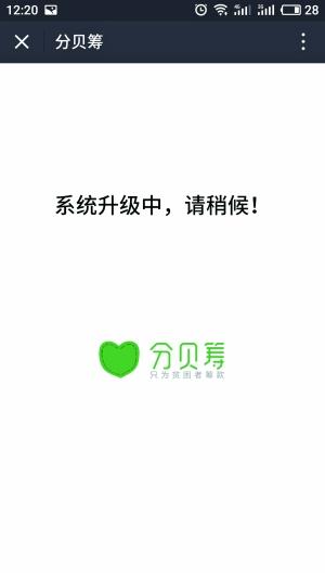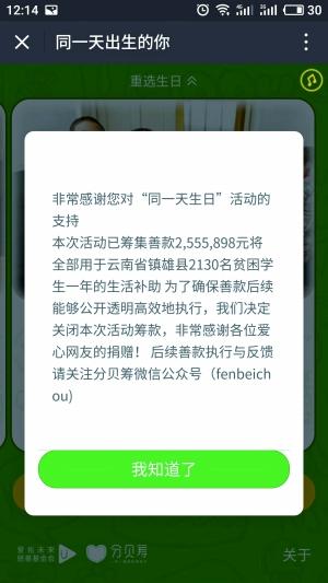 近日,“同一天生日”為貧困山區(qū)孩子籌款這一活動(dòng)在朋友圈刷屏,但與此同時(shí),被疑造假、信息有誤等聲音也出現(xiàn)在網(wǎng)端。對(duì)此,活動(dòng)主辦方分貝籌創(chuàng)始人微博回應(yīng)稱,最初僅為測(cè)試傳播率發(fā)到朋友圈,因未詳細(xì)檢查孩子信息導(dǎo)致大家誤解。北京晨報(bào)記者發(fā)現(xiàn),昨天中午平臺(tái)顯示系統(tǒng)升級(jí),已無(wú)法籌款。