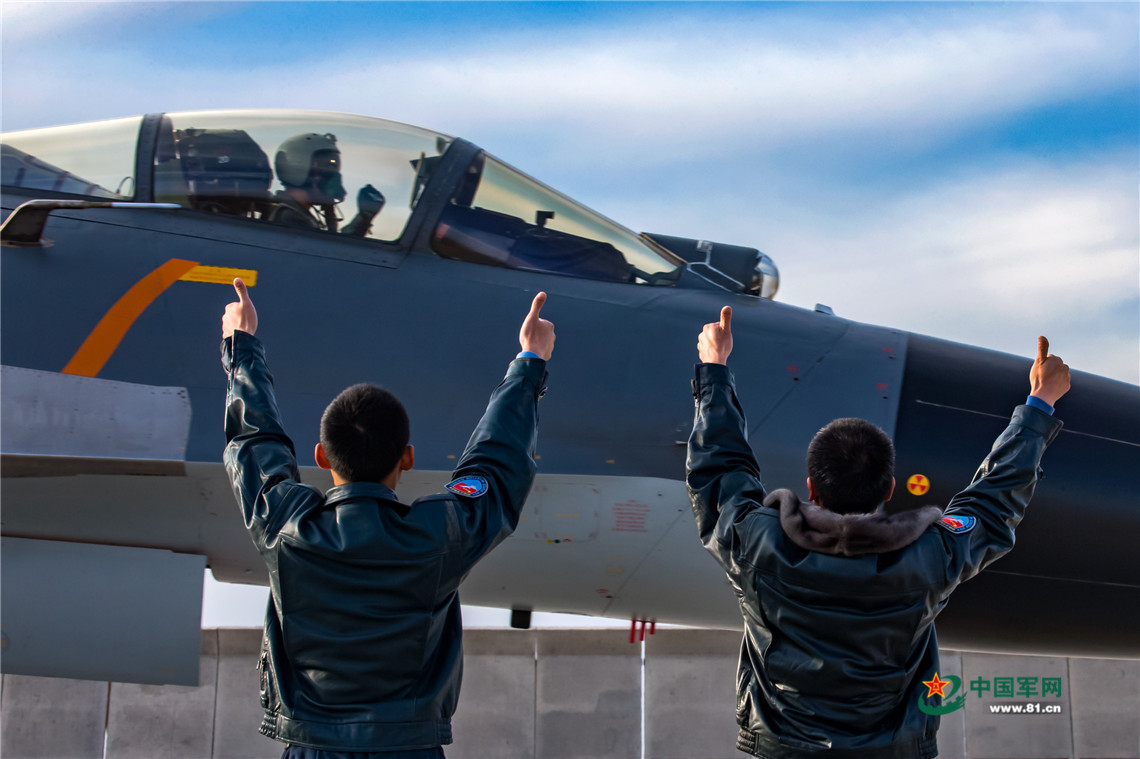“金頭盔-2017”空軍對抗空戰(zhàn)競賽考核,戰(zhàn)機(jī)滑出,飛行員為戰(zhàn)友鼓勁加油。楊盼 攝影