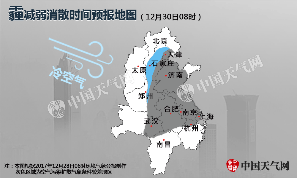 ??本次霾(2017年12月28日-30日)過程減弱消散預報圖。(稿件內(nèi)圖片來源:新華社、中國天氣網(wǎng)、視覺中國)