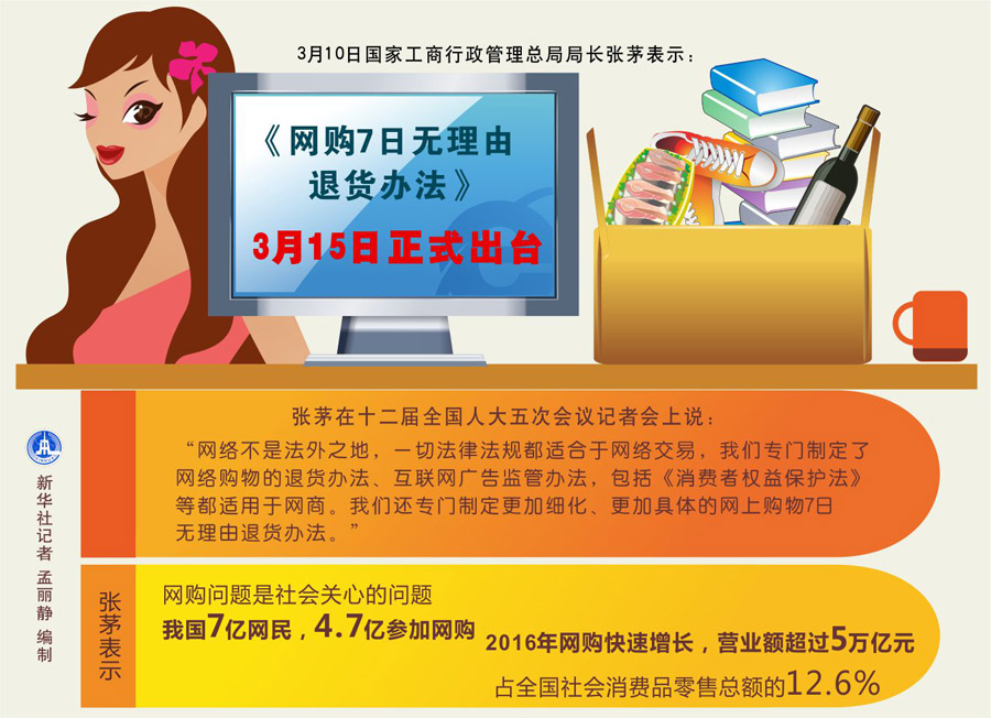 圖表:《網(wǎng)購7日無理由退貨辦法》3月15日正式出臺 新華社記者 孟麗靜 編制