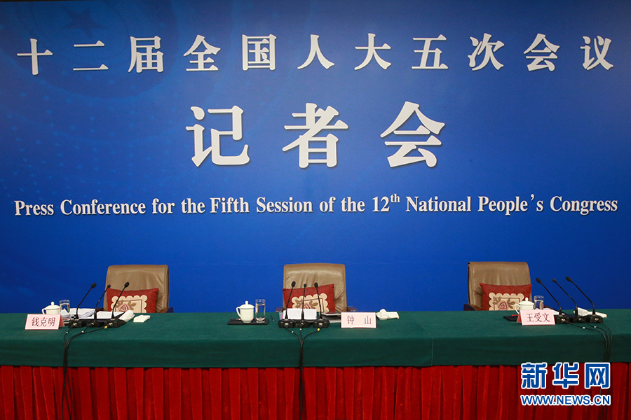 3月11日,十二屆全國人大五次會議新聞中心舉行記者會,主題是“改革開放調(diào)結(jié)構(gòu) 創(chuàng)新驅(qū)動促發(fā)展”,商務(wù)部部長鐘山、副部長王受文、副部長錢克明出席并回答中外記者的提問。圖為記者會現(xiàn)場。 新華網(wǎng)/中國政府網(wǎng) 傅義洲 攝