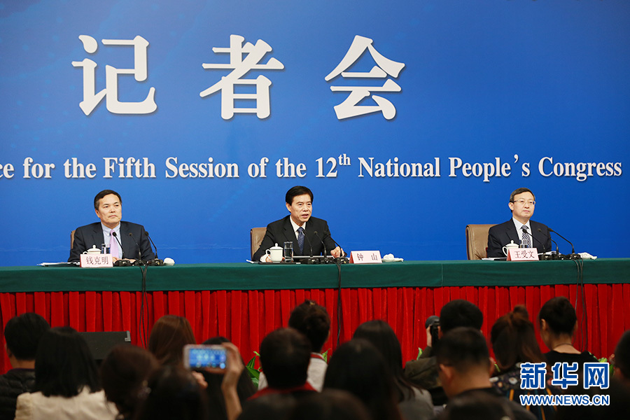 3月11日,十二屆全國(guó)人大五次會(huì)議新聞中心舉行記者會(huì),主題是“改革開放調(diào)結(jié)構(gòu) 創(chuàng)新驅(qū)動(dòng)促發(fā)展”,商務(wù)部部長(zhǎng)鐘山、副部長(zhǎng)王受文、副部長(zhǎng)錢克明出席并回答中外記者的提問。圖為記者會(huì)現(xiàn)場(chǎng)。 新華網(wǎng)/中國(guó)政府網(wǎng) 傅義洲 攝