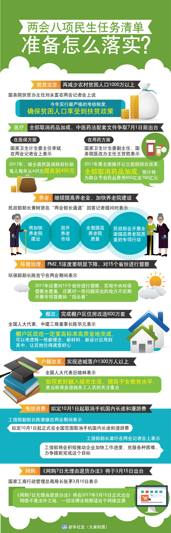 圖表:兩會八項(xiàng)民生任務(wù)清單準(zhǔn)備怎么落實(shí)? 新華社發(fā) 大巢制圖