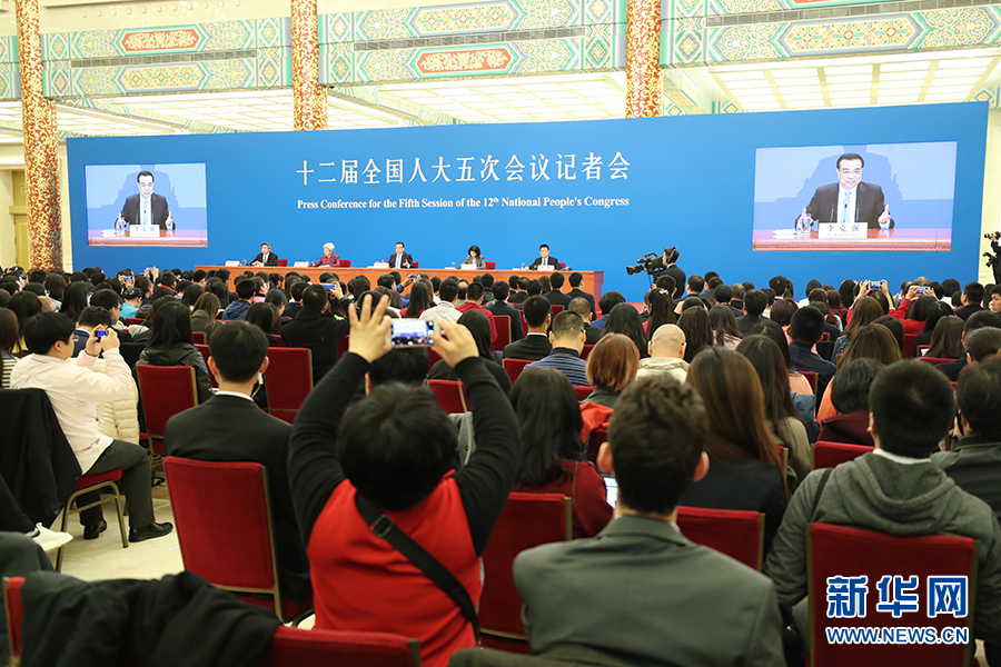3月15日上午,國務(wù)院總理李克強(qiáng)在人民大會(huì)堂三樓金色大廳會(huì)見采訪十二屆全國人大五次會(huì)議的中外記者并回答記者提出的問題。圖為記者會(huì)正在進(jìn)行。新華網(wǎng)/中國政府網(wǎng) 翟子赫 攝?