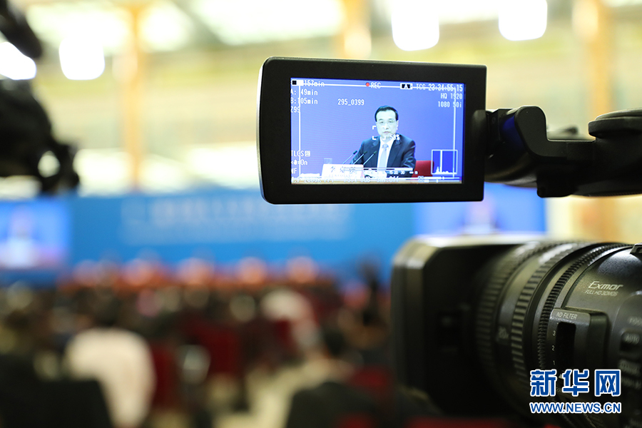 3月15日上午,國務(wù)院總理李克強(qiáng)在人民大會堂三樓金色大廳會見采訪十二屆全國人大五次會議的中外記者并回答記者提出的問題。圖為記者會現(xiàn)場。新華網(wǎng)/中國政府網(wǎng) 翟子赫 攝?