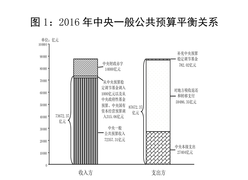 中央一般公共預算收入72357.31億元,為調(diào)整預算的100%,比2015年同口徑增長1.2%。加上從中央預算穩(wěn)定調(diào)節(jié)基金調(diào)入1000億元,從中央政府性基金預算、中央國有資本經(jīng)營預算調(diào)入315.06億元,收入總量為73672.37億元。中央一般公共預算支出86890.35億元(其中,中央本級支出27404億元,中央對地方稅收返還和轉移支付59486.35億元),完成調(diào)整預算的99.1%,增長4.5%。加上補充中央預算穩(wěn)定調(diào)節(jié)基金782.02億元,支出總量為87672.37億元。收支總量相抵,中央財政赤字14000億元,與預算持平。2016年中央預備費預算500億元,實際支出146.1億元,剩余353.9億元全部轉入中央預算穩(wěn)定調(diào)節(jié)基金。2016年末,中央財政國債余額120066.75億元,控制在年度預算限額125908.35億元以內(nèi);中央預算穩(wěn)定調(diào)節(jié)基金余額2678.06億元(含通過收回中央財政結轉資金補充1501.83億元)。