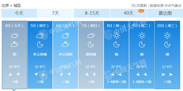 今天氣溫將處于冰點以下,明起稍有回升。北京市氣象臺預(yù)計,今晨上班時多云,北轉(zhuǎn)南風(fēng)二三間四級,-5~-3℃;白天多云轉(zhuǎn)陰,北轉(zhuǎn)南風(fēng)二三間四級,最高氣溫僅0℃,為本周最低點;夜間陰轉(zhuǎn)多云,西部山區(qū)有零星小雪,南轉(zhuǎn)北風(fēng)一二級,最低氣溫-8℃,晝夜溫差達(dá)到8℃。明天開始至周日最高氣溫將回升到2~3℃,但到下周初又將再次回落至冰點。
