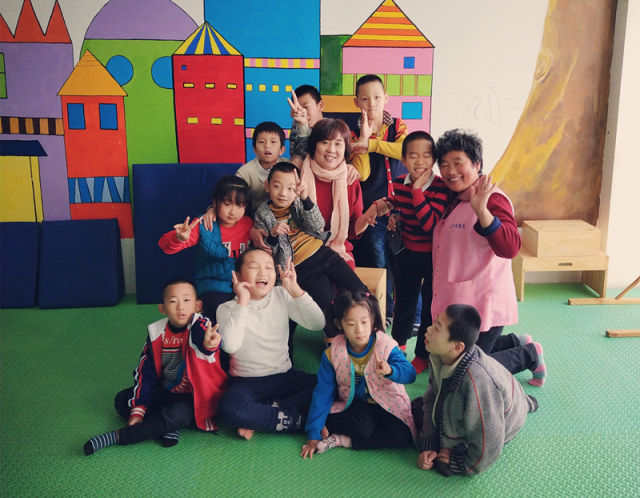 賈秀芳與康復中心的腦癱患兒(2017年11月25日攝)