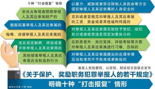 “舉報(bào)人的舉報(bào)行為可能會(huì)使違法者面臨較大數(shù)額的罰金甚至刑事處罰,因此,被舉報(bào)者可能會(huì)對(duì)舉報(bào)人及其家人進(jìn)行或明或暗的報(bào)復(fù)。”杜立元說(shuō)。內(nèi)部舉報(bào)人往往是企事業(yè)單位職工、公務(wù)員等,如果保護(hù)機(jī)制不健全,就可能遭遇調(diào)換崗位等隱性報(bào)復(fù)行為。舉報(bào)人如何尋找申訴部門、如何對(duì)遭到打擊報(bào)復(fù)的舉報(bào)人進(jìn)行救濟(jì)等,都是亟需解決的問(wèn)題。