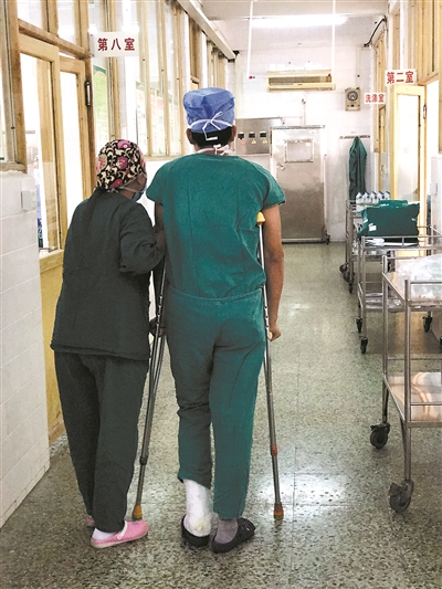 打著石膏拄著拐杖做手術(shù) 他說:“病人多醫(yī)生少,能做就做吧”